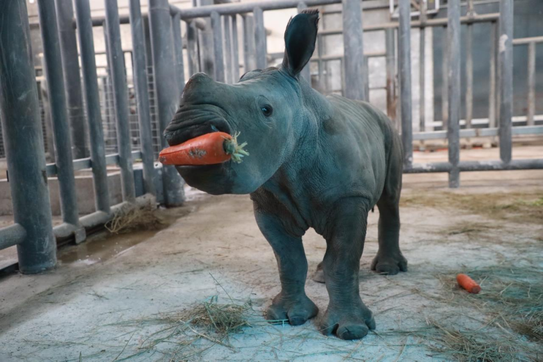 白犀寶寶的爸爸叫安安,媽媽叫迎迎,2018年3月一起從南非來(lái)到秦嶺野生動(dòng)物園定居。在2021年的春天,白犀媽媽迎迎懷孕,在經(jīng)歷18個(gè)月的孕育后,我們的白犀寶寶成功出生。白犀寶寶在媽媽的幫助下,出生半小時(shí)左右就開(kāi)始學(xué)習(xí)站立,出生一個(gè)小時(shí)后已可以自主站立。這只白犀寶寶性格活潑好動(dòng),雖然主食仍靠母乳,但有時(shí)也會(huì)叼一根胡蘿卜和媽媽一起玩耍嬉戲。